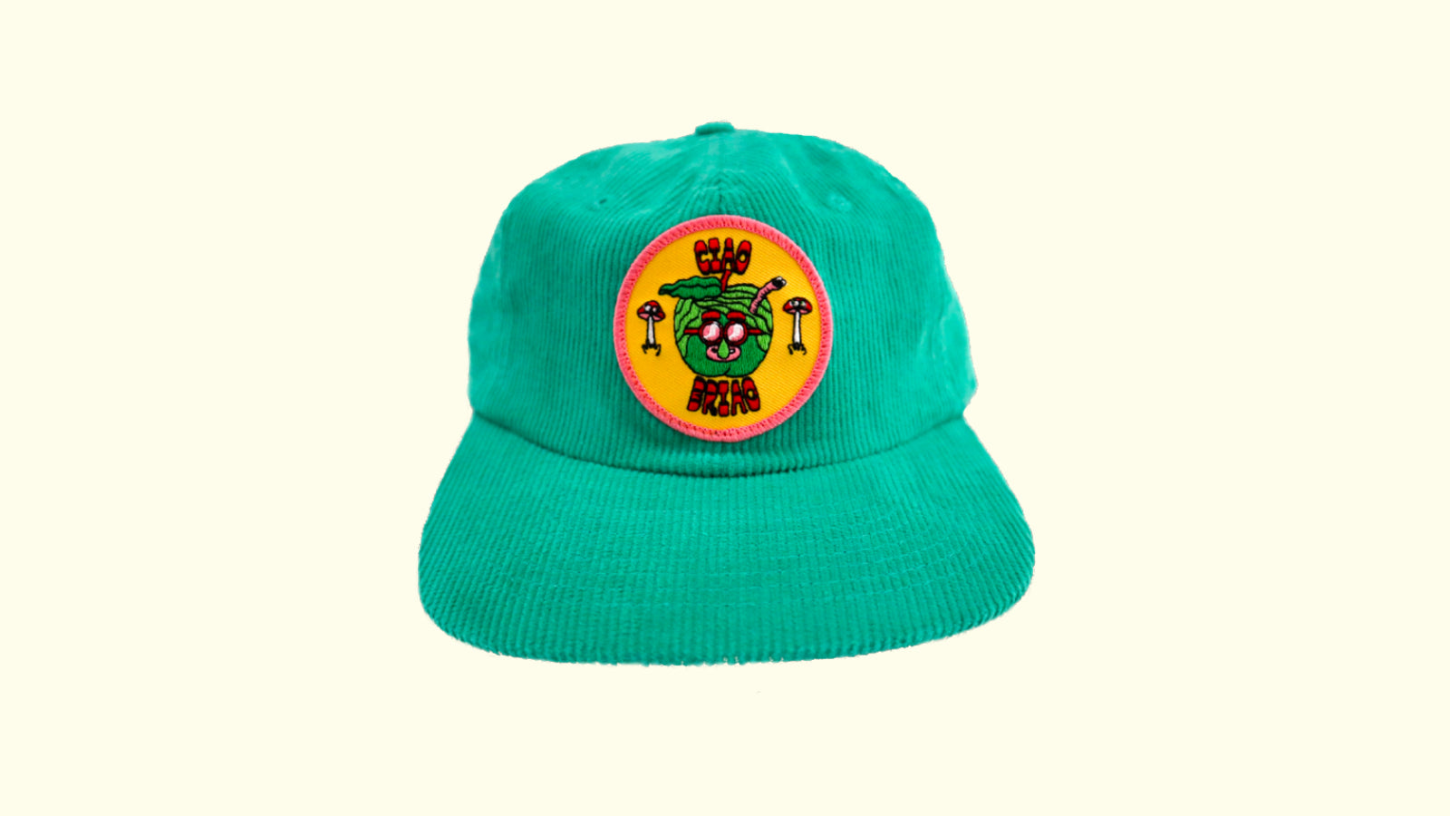 Back by popular demand, the green apple corduroy lid is now adorned by an actual green apple... plus some cute mushrooms and a wriggly worm. And in a Fry Baby first, it's available in adults and kids sizes. The artist Nicko Phillips is stoked to bring 'ciao', the Italian word for hello/goodbye, and 'briao', the made-up word for 'bro' finally together on this lid. Get this boi on your brow to let people know you're a real juicy briao.