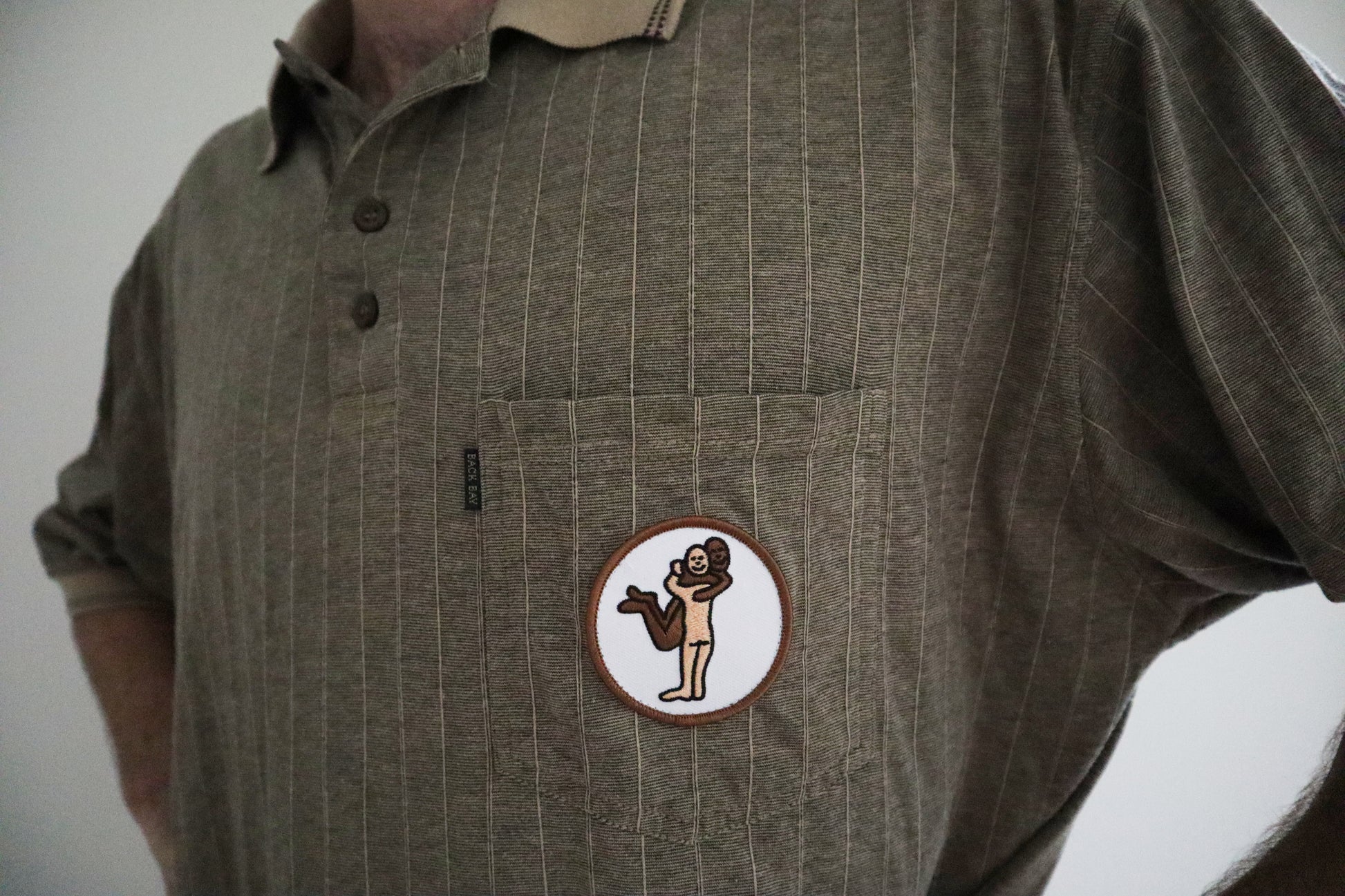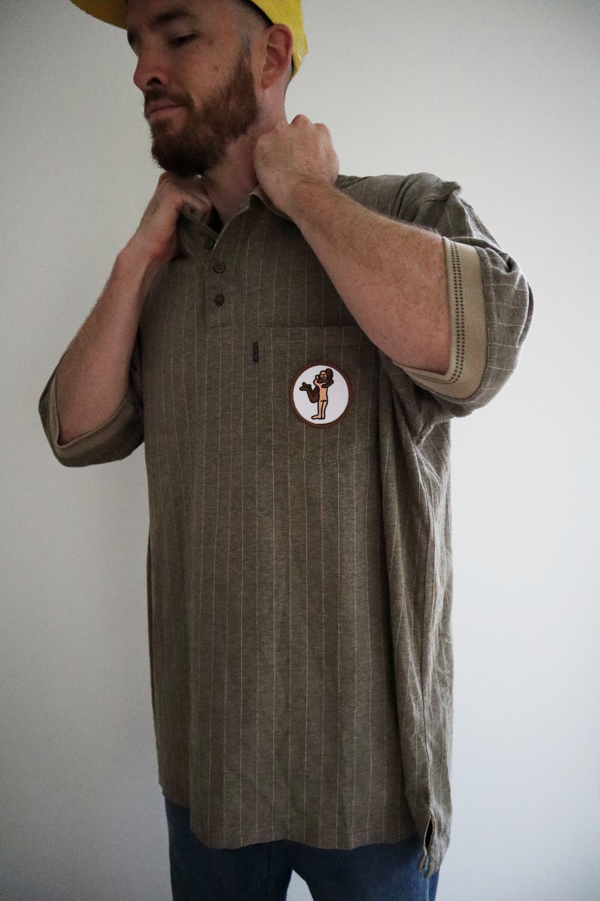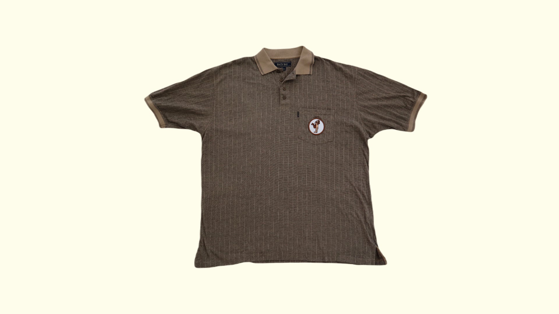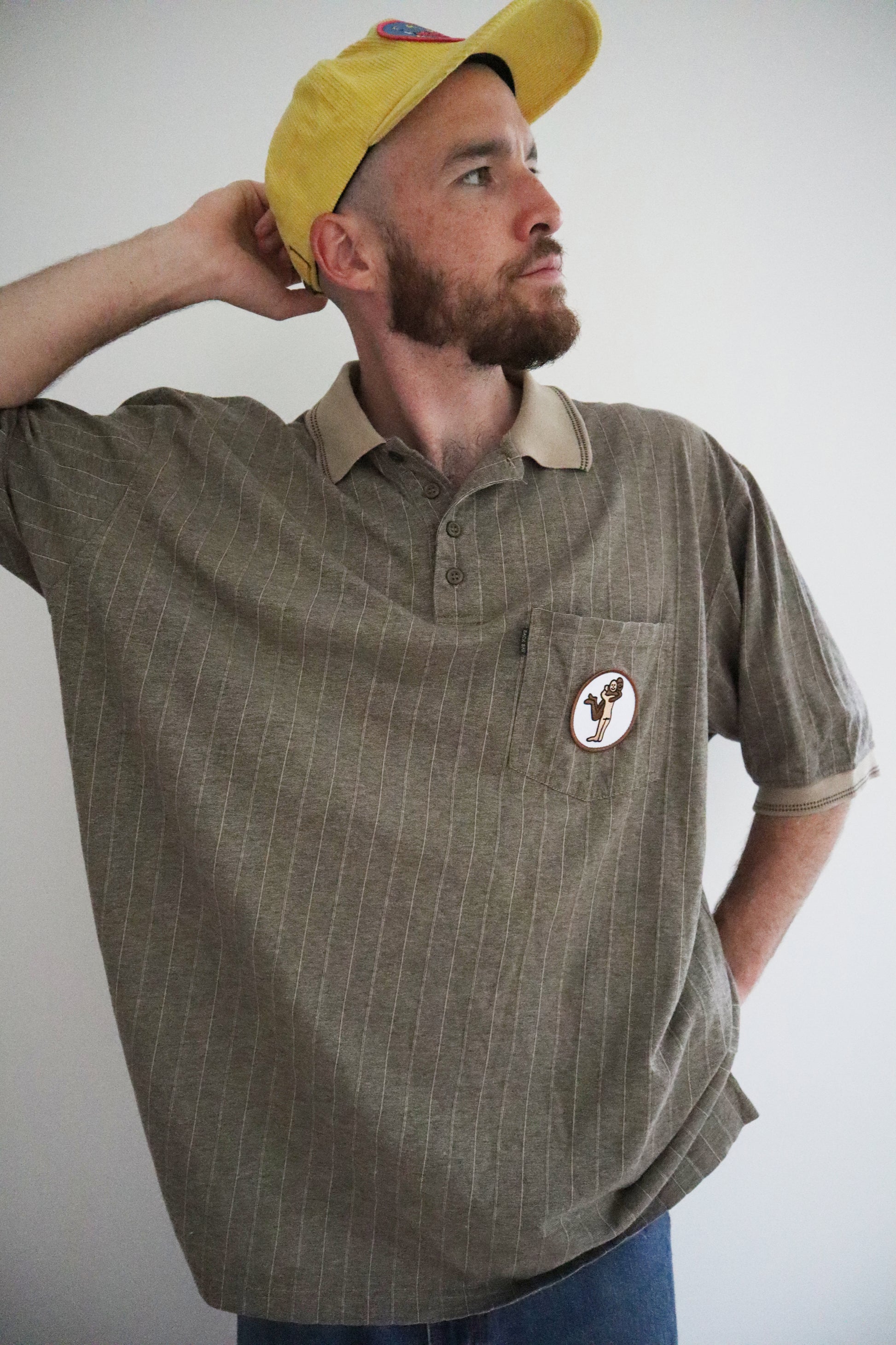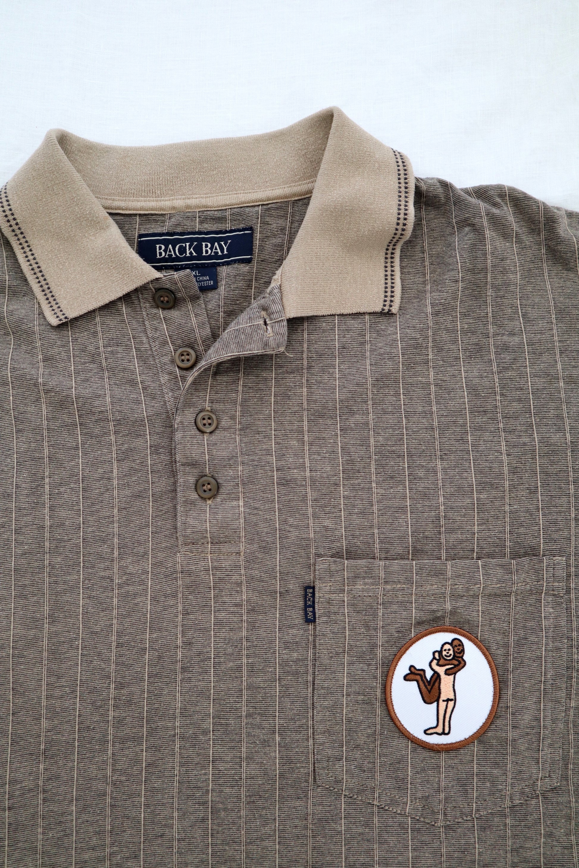 This vintage oversize Back Bay polo is an all year round special featuring tattooist Brodie Jackson's 'Hug It Out' patch from 2021. It features the two tone collar and trim on the sleeves, four buttons and a single/double stripe combo and while the 4XL on the tag tells you it's a big shirt, the patch tells you it's worth a big hug.