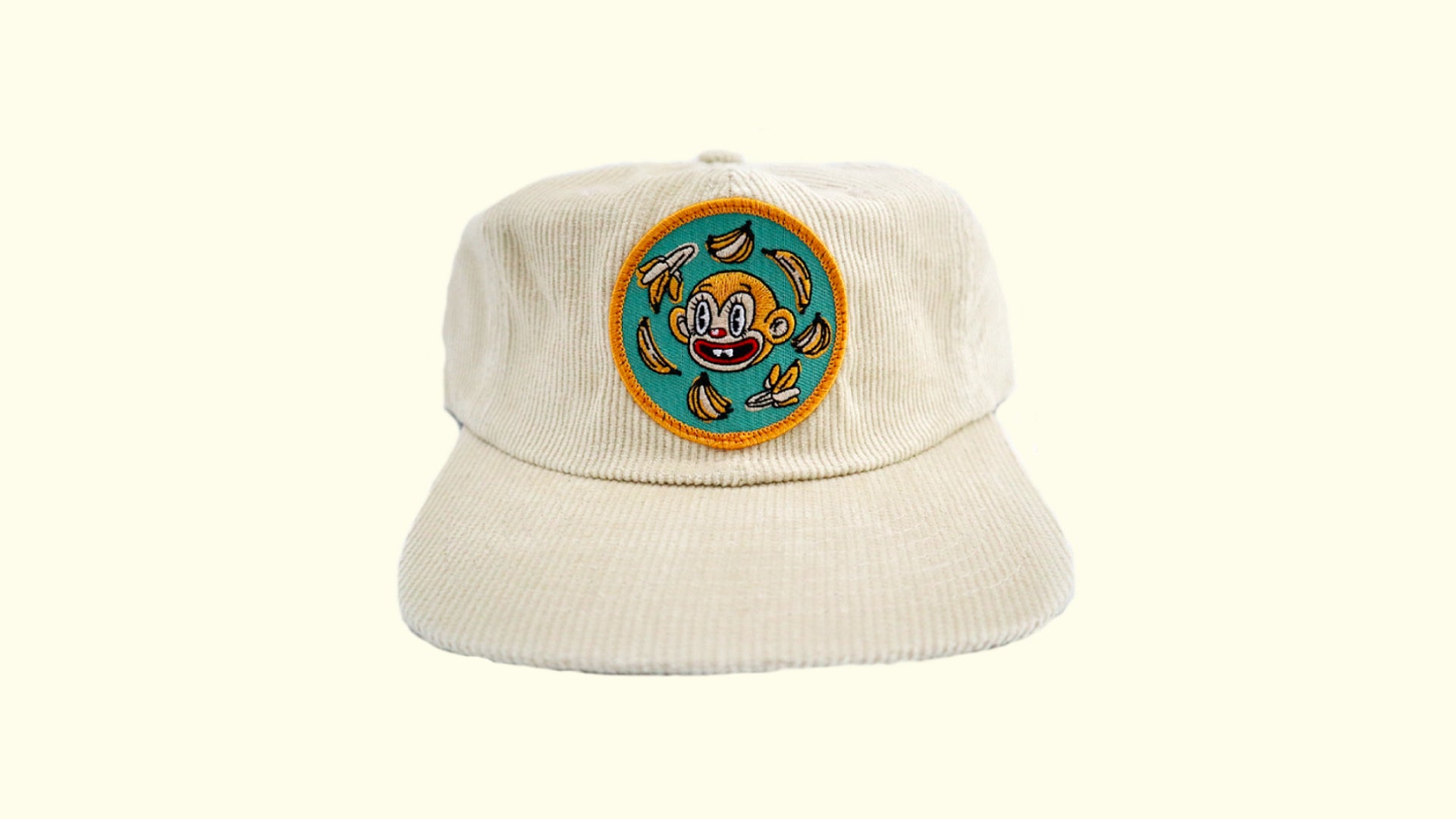 There's always time to monkey around in this new cord by Ginger Taylor. With the cheekiest of looks on this tree dwelling creature, you'll be grinning from ear to ear with this lid atop your noggin. And don't all the colours work in beautifully - the cream corduroy, bananas and of course that happy monkey.
