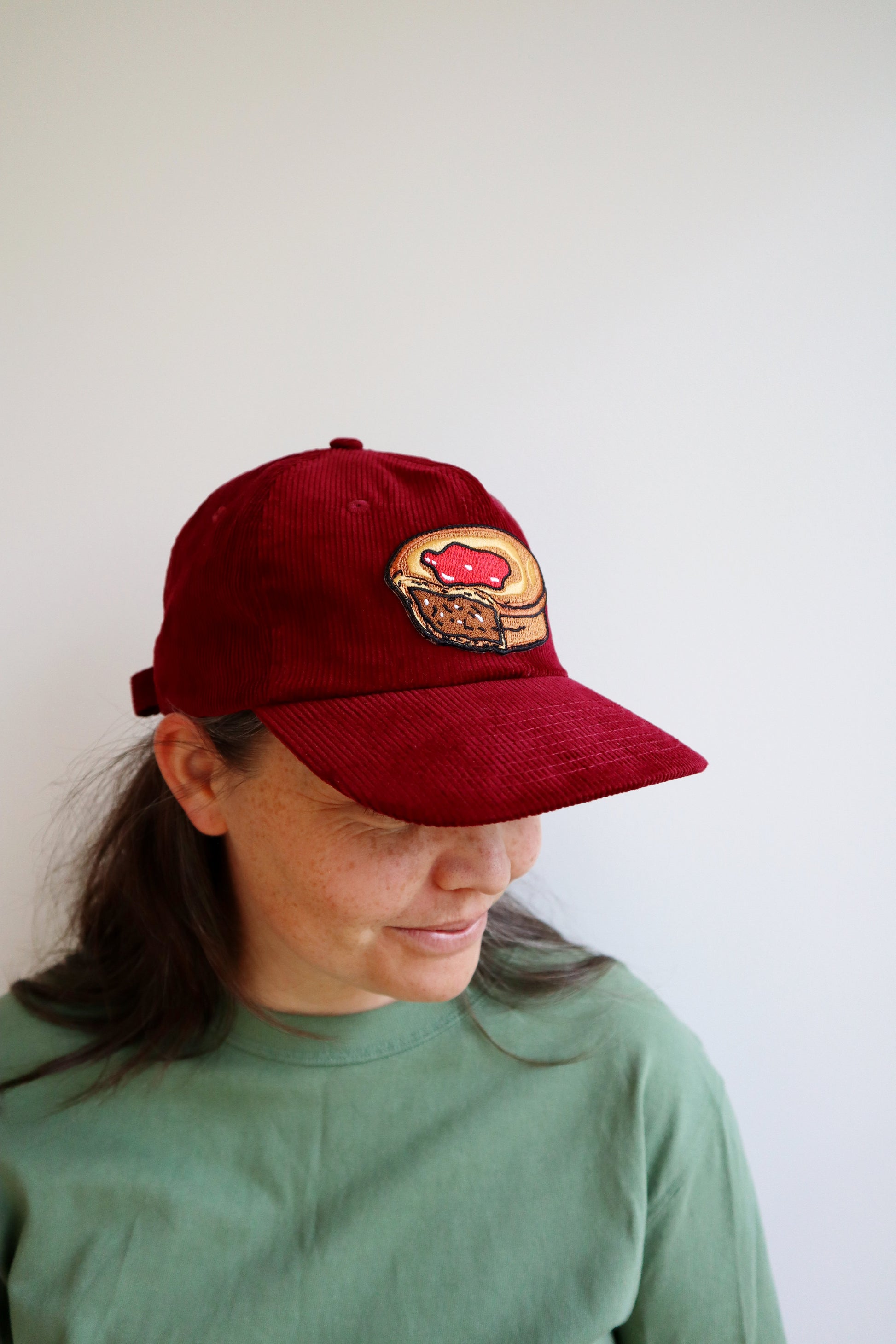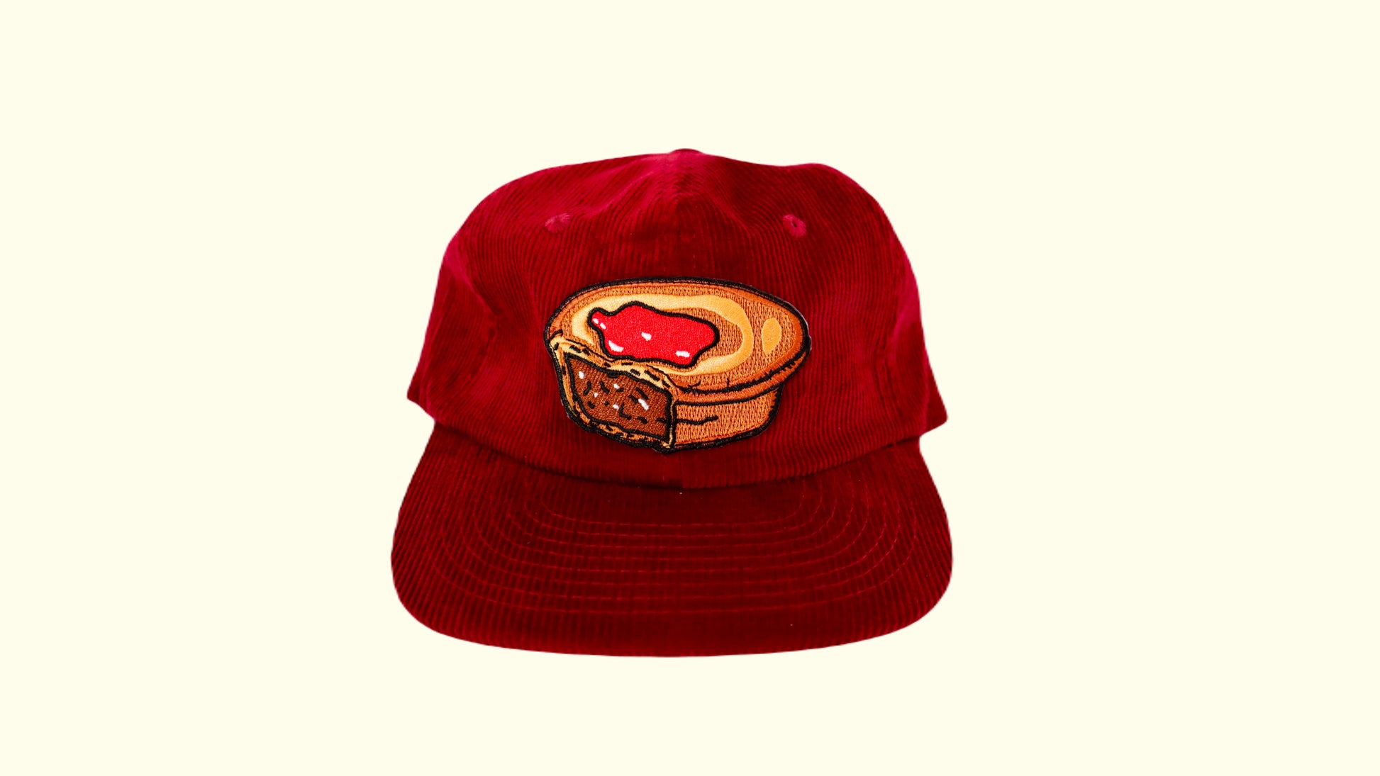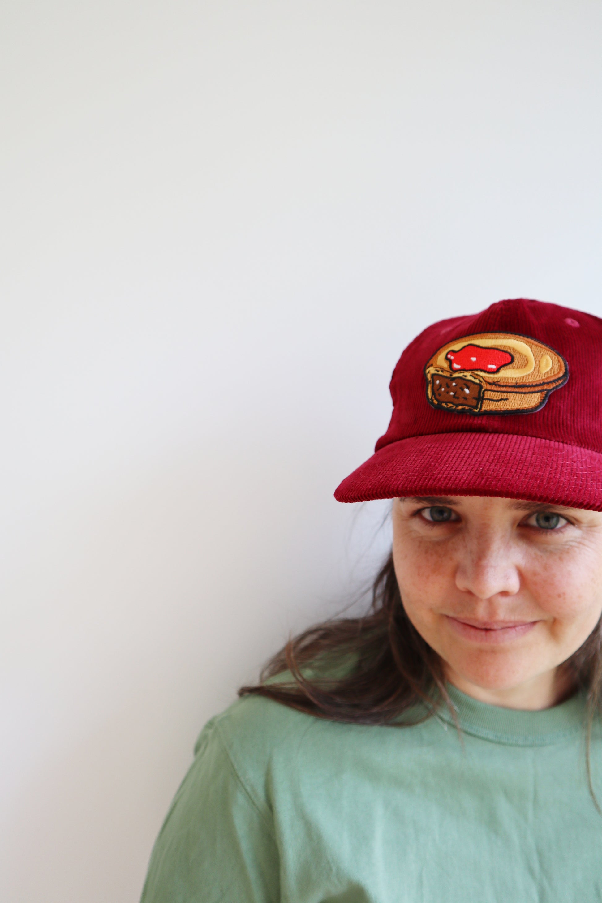 Fry Baby and Billie Justice Thomson served up a negroni hat in 2021, now it's time for some good quality food with your bev. Introducing the Pie hat, the tastiest lid you might have ever seen. Billie's pie illustration is a classic that she used to print on greeting cards, but this embroidered patch on the burgundy coloured corduroy hat is a next level celebration of the humble pie. We've also done a 'Pizza' hat with Billie so whether you're a pie head or a pizza fan, or both, there's a BJT Fry Baby for you! Don't wait too long either, the Negroni was one of the quickest ever to sell out and these are best served piping hot.
