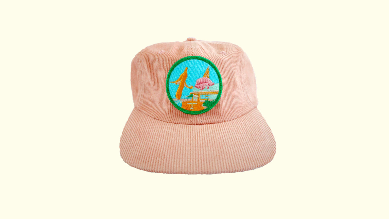 In a Fry Baby first, the patch adorning this salmon cord has been transformed from a photograph by Ben Thomas. We're making history! Ben took the picture a few years ago of a little ice cream and milkshake shop. He thought at the time that it would make a neat little illustration and how right he was. What's more Summery than a milkshake at the beach - on your head!