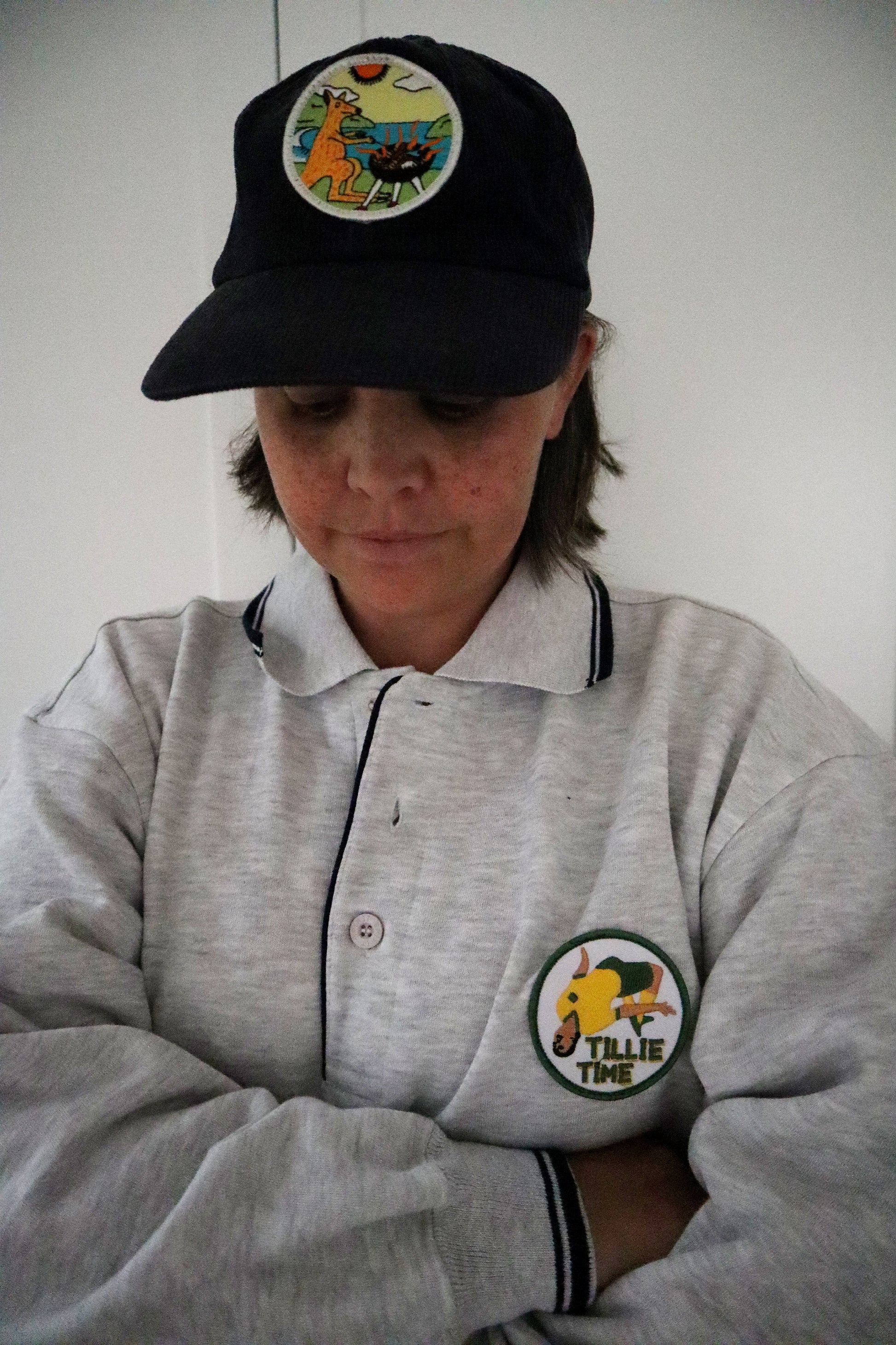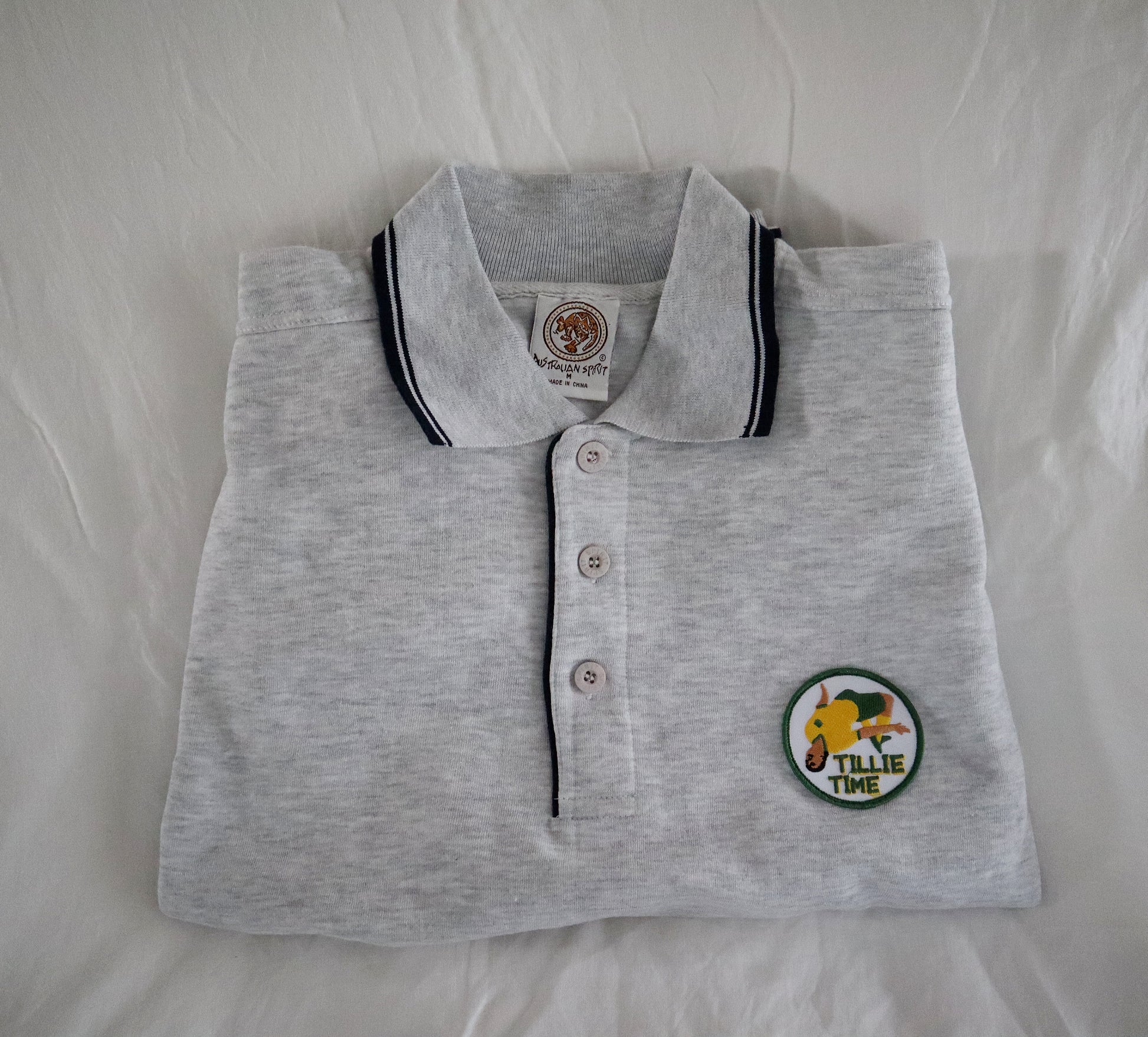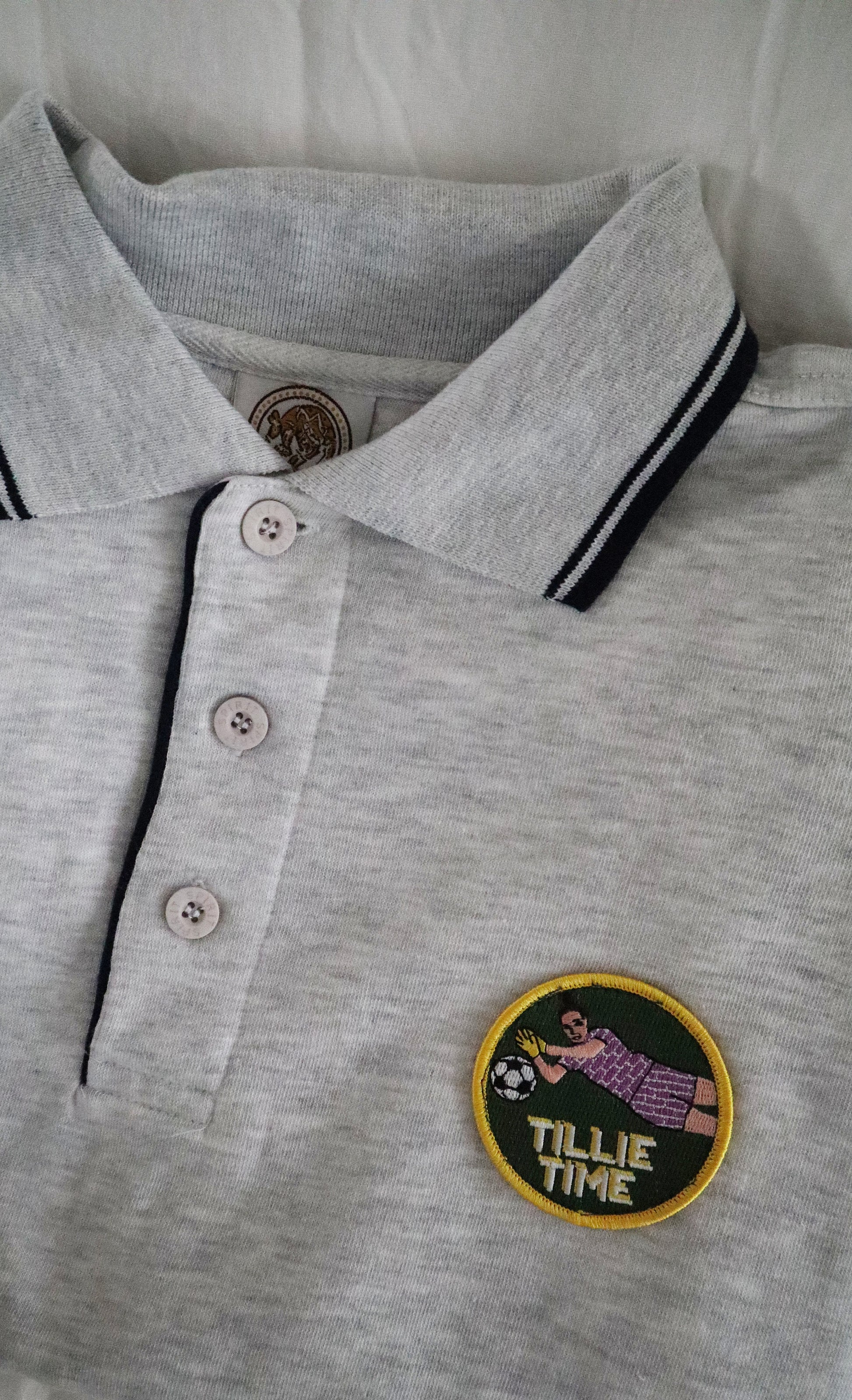 Three leftover 'Tillie Time' patches sewn onto three grey marle rugby shirts found at an op shop. It's a match made in heaven.